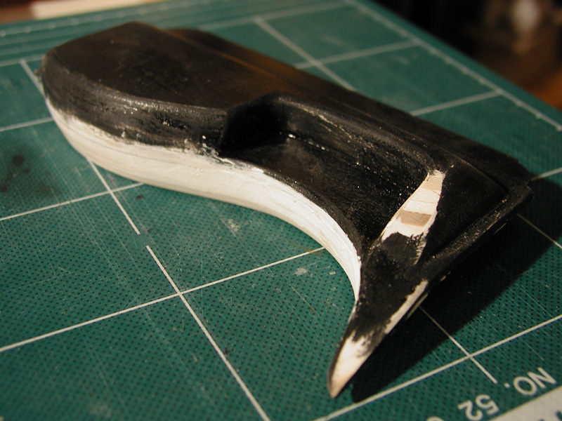 mit Feinspachtelmasse aufgefüllt, lackiert, geschmirgelt